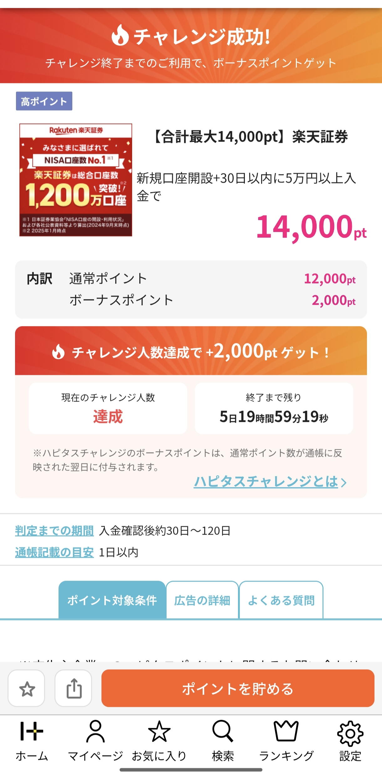 - ポイ活サイト「ハピタス」から「楽天証券の案件」に取り組み、14,000円をGET
