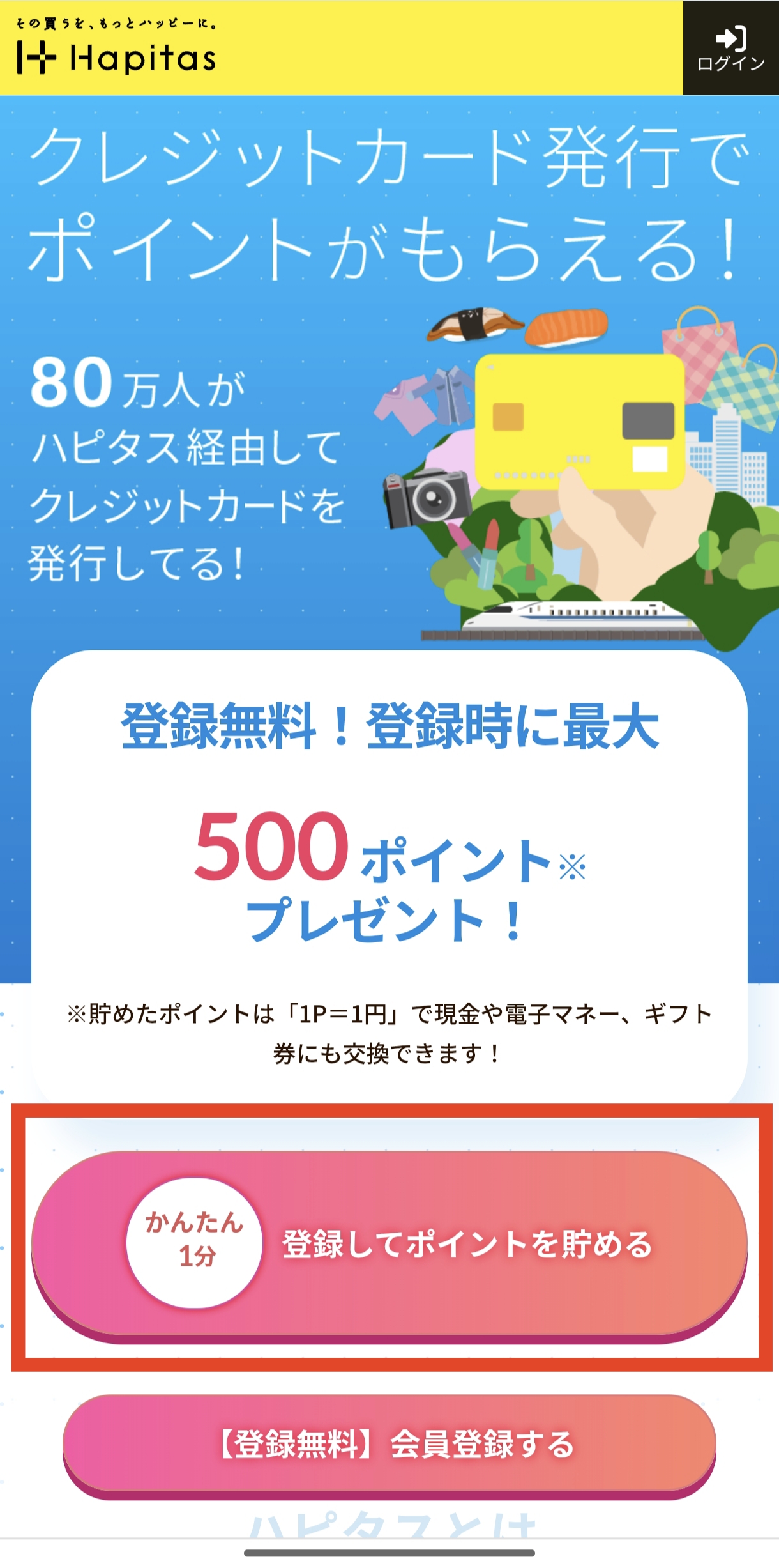 ①ポイントサイト「ハピタス」をダウンロードし、無料会員登録